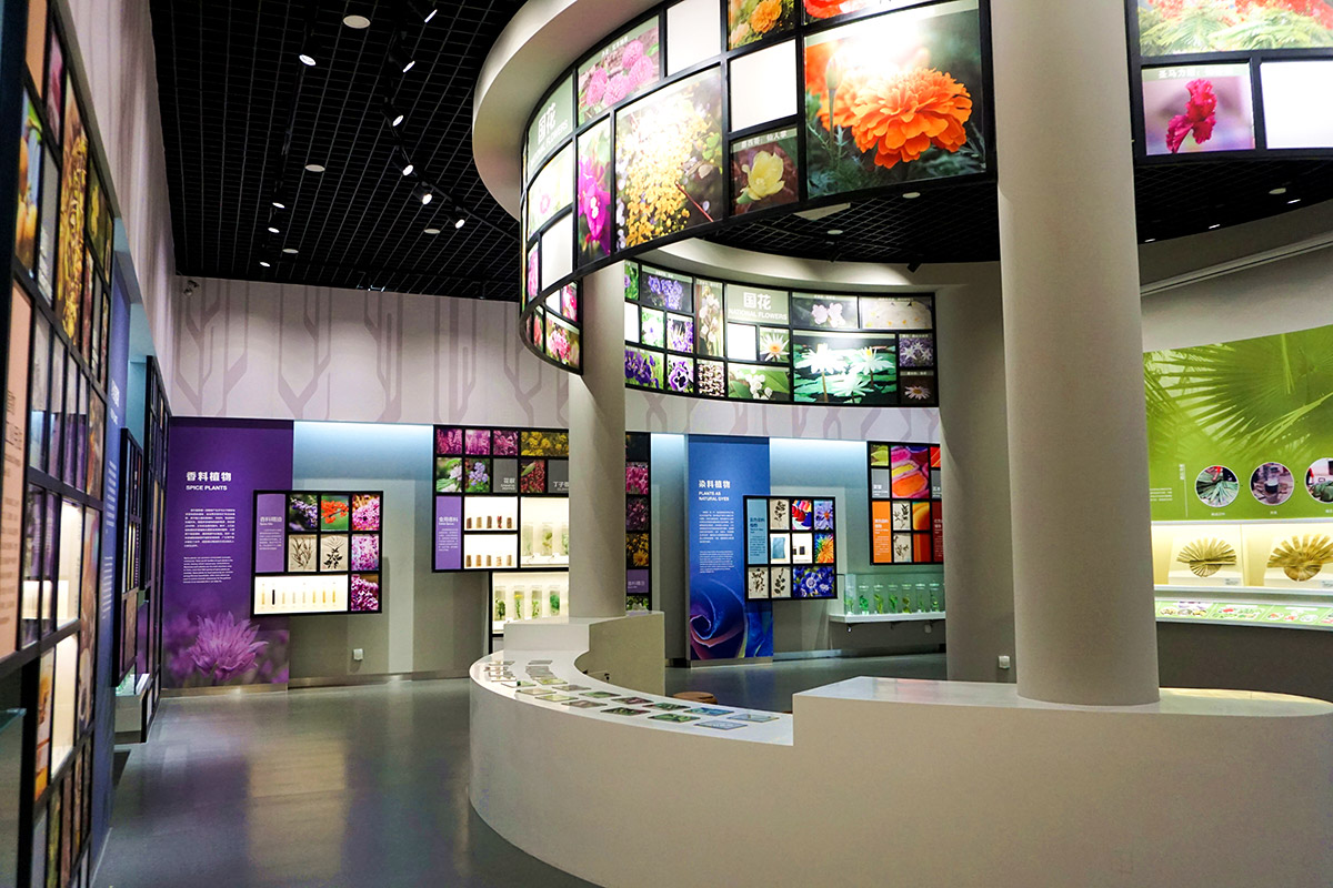 植物与人类展厅分为两个部分,外围墙面是第一部分,展示与人们的物质文明相关的植物内容,包括食用植物、药用植物、油料植物、纤维植物、香料植物、染料植物和其他具有重要经济价值植物共七个单元。展厅中央区域是本展厅的第二部分,展示了五十多个国家的国花,还展示了我国云南西双版纳地区傣族的贝叶经实物。
